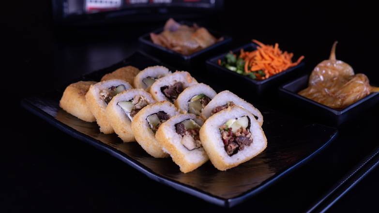 Inside - cream cheese, cucumber, avocado, beef, chicken, and bacon Adentro -philadelphia, aguacate, pepino, res, pollo, y Ticino
