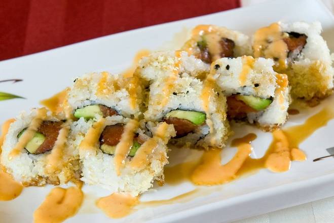 Spicy tuna cut roll with crunch on top (8 pieces).
