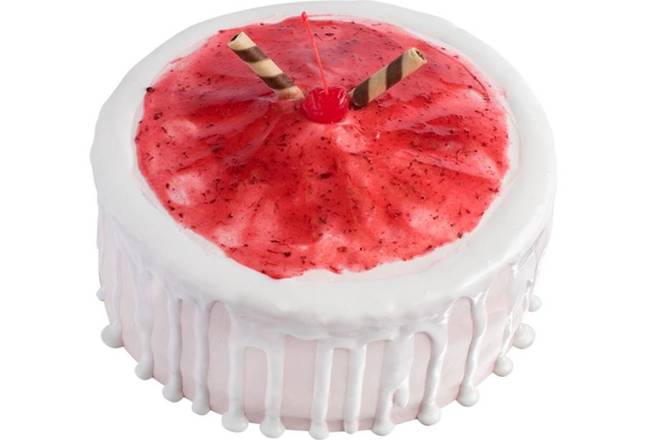 Vanilla cake, cream cheese frosting and strawberry mousse filling, topped with strawberry jam, white ganache, rolled waffles, and a cherry.