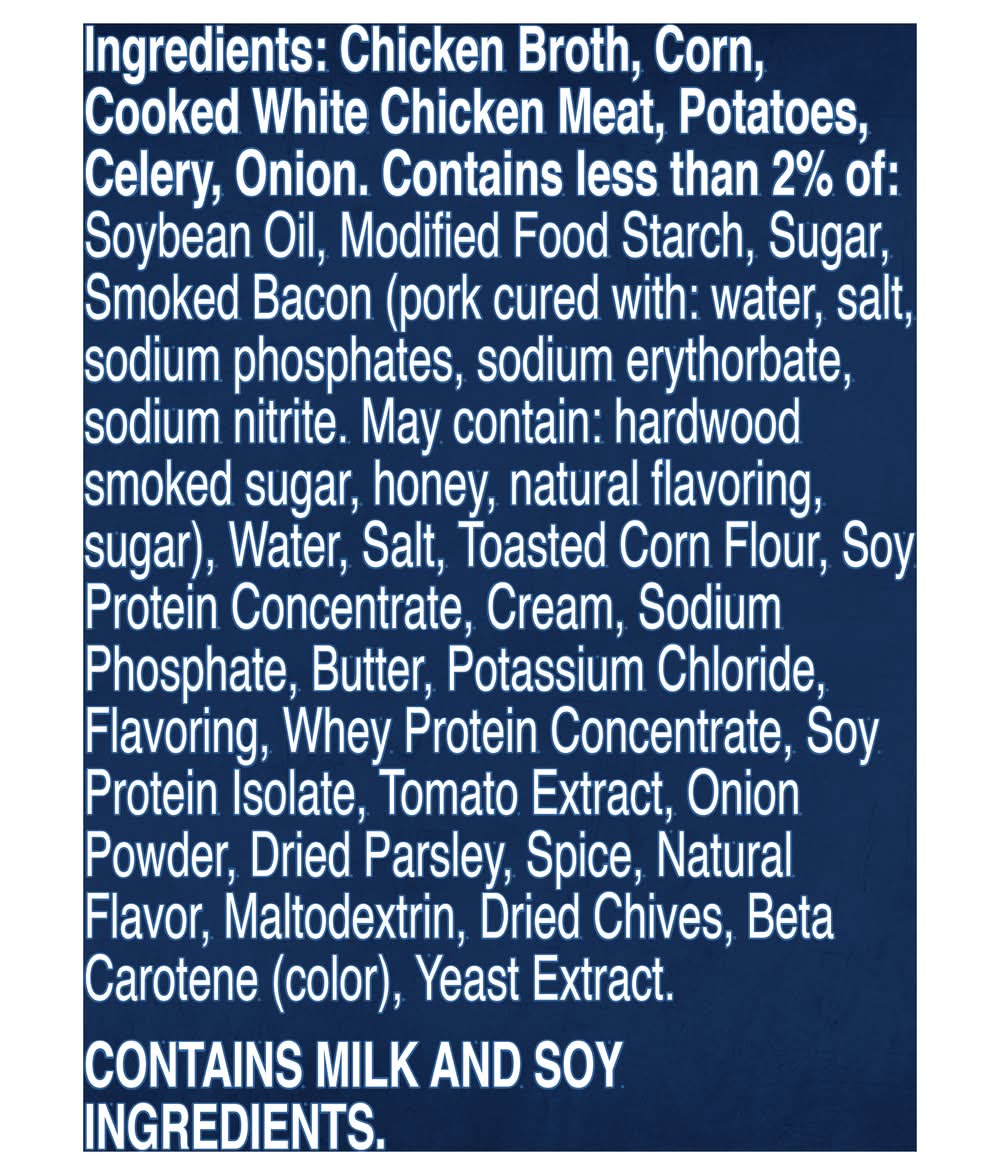 Ingredients: Chicken Broth, Corn, Cooked White Chicken Meat, Potatoes, Celery, Onion, Contains Less than 2% of: Soybean Oil, Modified Food Starch, Sugar, Smoked Bacon (Pork Cured with: Water, Salt, Sodium Phosphates, Sodium Erythorbate, Sodium Nitrite, May Contain: Hardwood Smoked Sugar, Honey, Natural Flavoring, Sugar), Water, Salt, Toasted Corn Flour, Soy Protein Concentrate, Cream, Sodium Phosphate, Butter, Potassium Chloride, Flavoring, Whey Protein Concentrate, Soy Protein Isolate, Tomato Extract, Onion Powder, Dried Parsley, Spice, Natural Flavor, Maltodextrin, Dried Chives, Beta Carotene (Color), Yeast Extract Contains: Celery, Soybeans, Milk