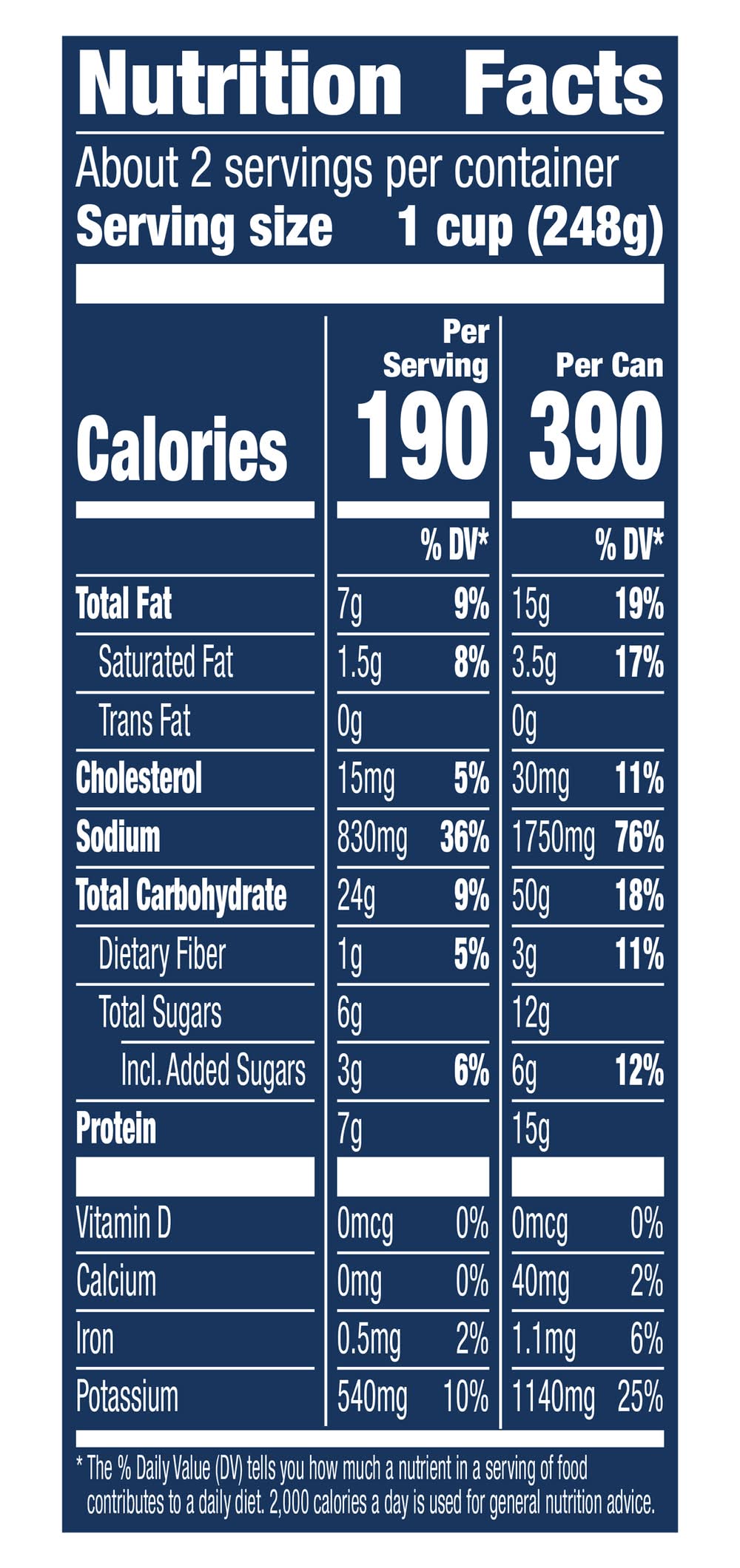 Flavored with bacon. No artificial flavors. Per 1 Cup Serving: 190 calories; 1.5 g sat fat (8% DV); 830 mg sodium (36% DV); 6 g total sugars. Gluten free. Rich & hearty. For over 100 years, our kitchens have crafted honest, soul-satisfying recipes with real ingredients you're proud to serve. • Flavor: Chicken corn chowder • General Mills Sales, Inc., Minneapolis,MN,55440,USA • Packaging: Reusable