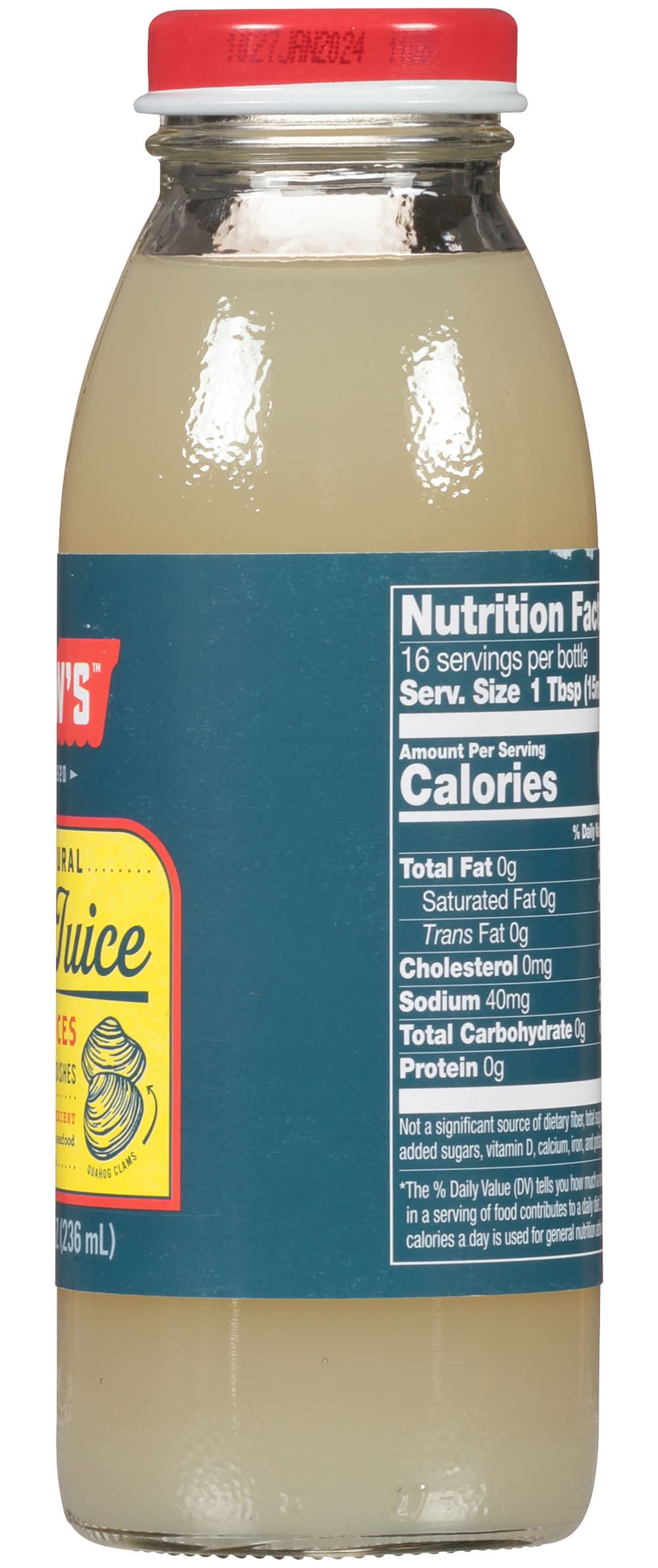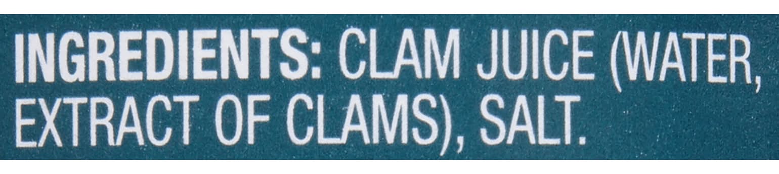 Ingredients: Clam Juice (Water, Extract of Clams), Salt Contains: Crustacean Shellfish