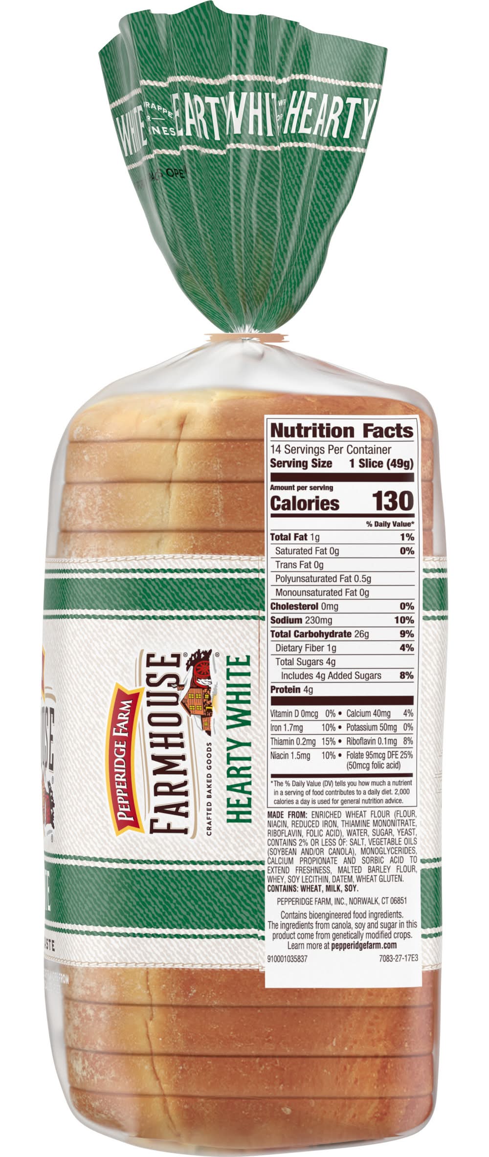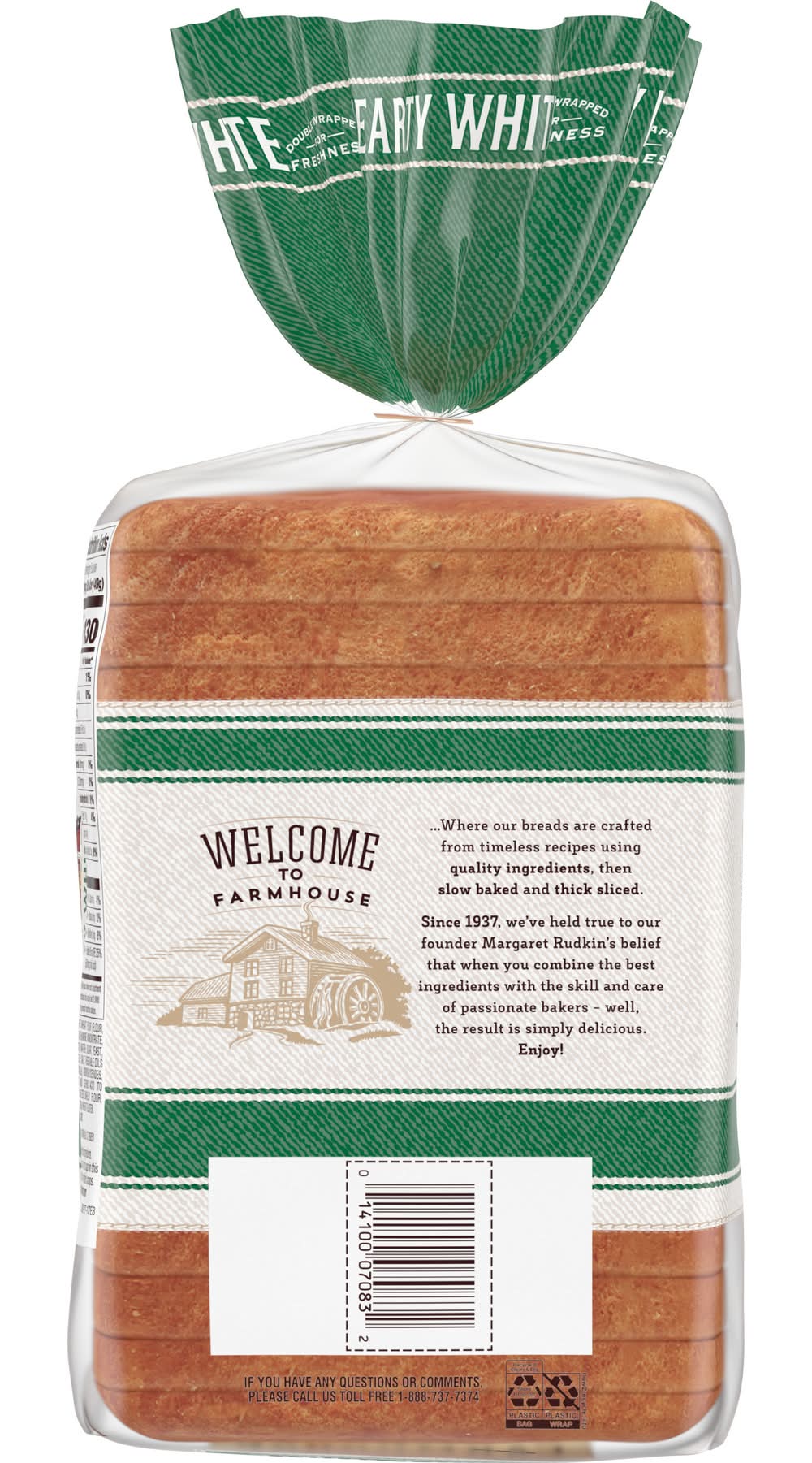 Farmhouse is the bread you would make if you made bread. we have been baking delicious breads inspired by small batch recipes and crafted with premium ingredients for over 75 years. For us, baking is more than a job, it’s a real passion. Our dedication to quality shows in the care we put into every detail. Farmhouse Hearty White Bread stays true to the classic recipe you know and love: A delicious, versatile white bread baked with quality ingredients and a touch of sweetness with no high fructose corn syrup and no colors or flavors from artificial sources. These thick slices of sandwich bread are soft, yet strong enough to stand up to any sandwich ingredient. And with a delightfully mild flavor, it’s the perfect bread for sandwich lovers. Enjoy the great taste of homemade, because after all, there’s no taste like home. • Pepperidge Farm, Inc., Norwalk, CT, 06856 • Packaging: Reusable