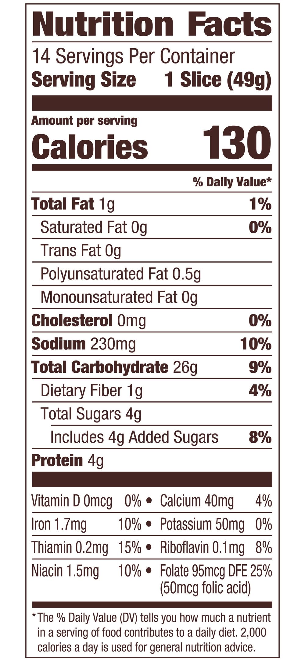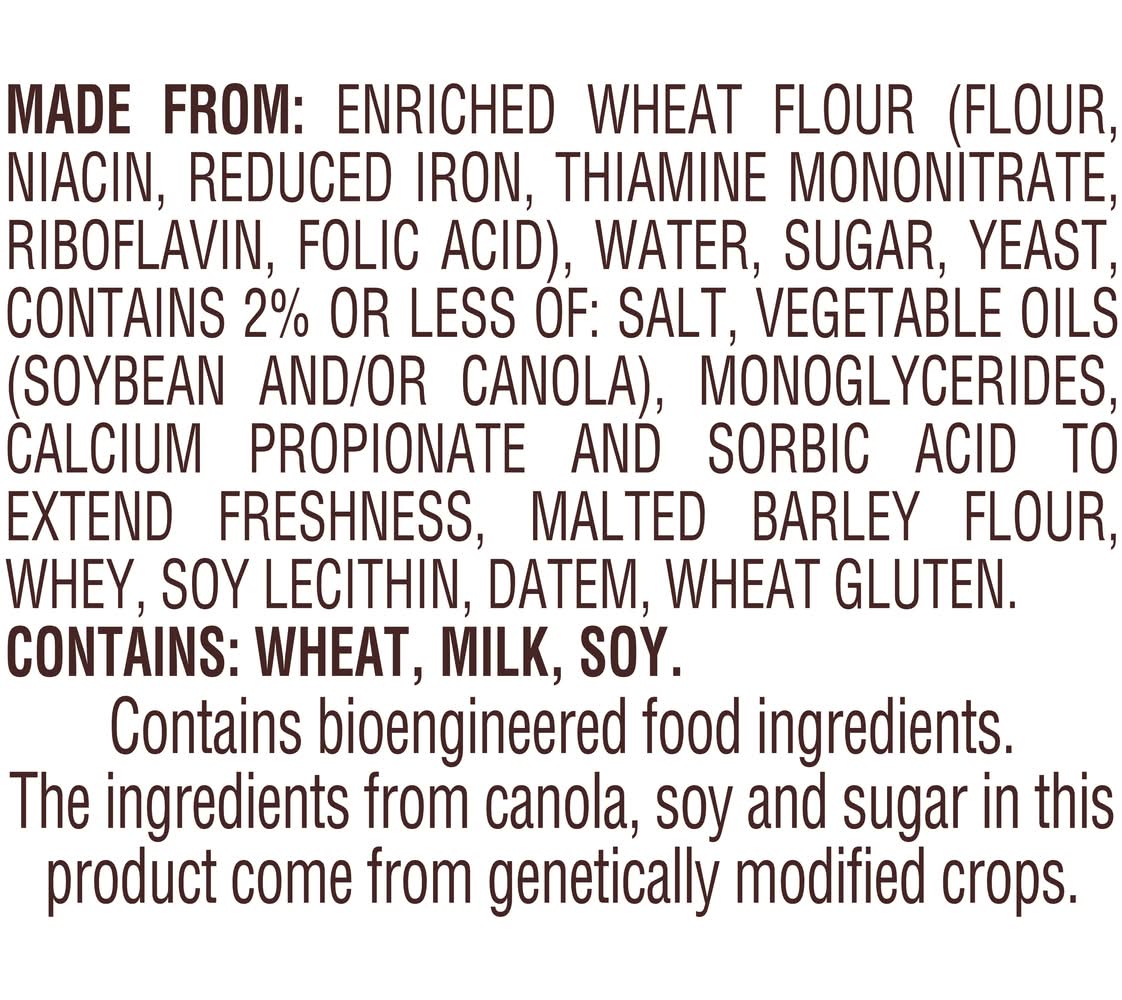 Ingredients: MADE FROM: ENRICHED WHEAT FLOUR (FLOUR, NIACIN, REDUCED IRON, THIAMINE MONONITRATE, RIBOFLAVIN, FOLIC ACID), WATER, SUGAR, YEAST, CONTAINS 2% OR LESS OF: SALT, VEGETABLE OILS (SOYBEAN AND/OR CANOLA), MONOGLYCERIDES, CALCIUM PROPIONATE AND SORBIC ACID TO EXTEND FRESHNESS, MALTED BARLEY FLOUR, WHEY, SOY LECITHIN, DATEM, WHEAT GLUTEN. CONTAINS: WHEAT, MILK, SOY. Contains: Milk/Dairy, Soybean, Wheat, Gluten