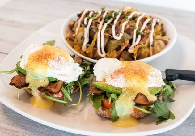 Hickory smoked bacon, ripe avocado, tomatoes and baby arugula on a toasted English muffin.