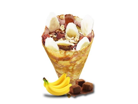 Sliced bananas, chocolate truffles, chocolate custard cream, whipped yogurt, chocolate sauce, granola.