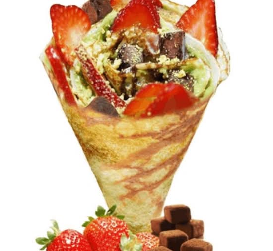 Sliced Strawberries, Chocolate Truffles, Matcha Custard Cream, Whipped Yogurt, Chocolate Sauce, Crushed Pistachio