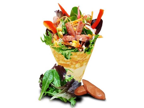 Okinawa Hot Dog, Mesclun Mix, Julienned Carrots, Cheddar Cheese, Red Onions, Red Peppers, Corn, Banana Ketchup, Tofu Sauce.
