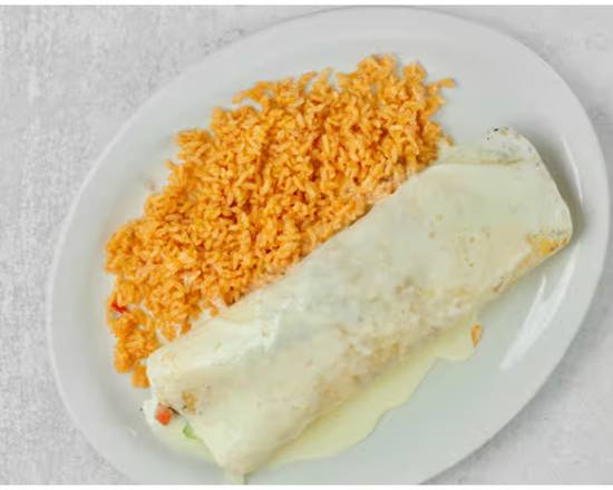 Grilled chicken, steak, shrimp and chorizo with lettuce, sour cream and pico de gallo in a 10" flour tortilla covered with cheese sauce. Served with rice.