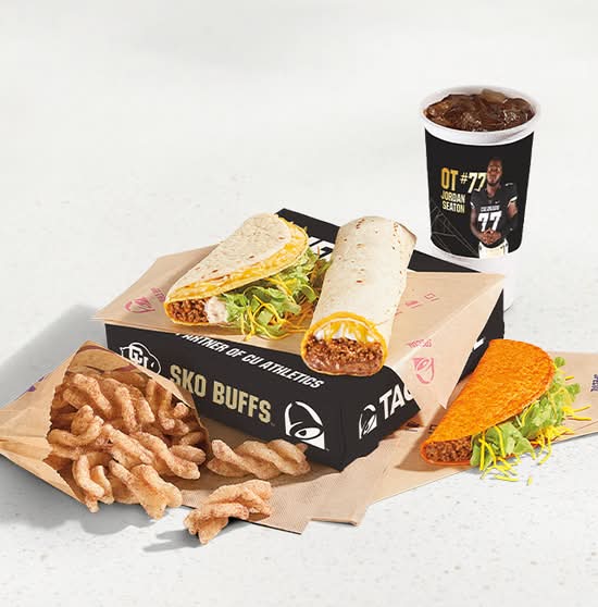 Sko Buffs! Score a Cheesy Gordita Crunch, a Beefy 5 Layer Burrito, a Doritos® Locos Taco, Cinnamon Twists, and a large fountain drink all season long. For a limited time only while supplies last. (1320-1740 cal.)