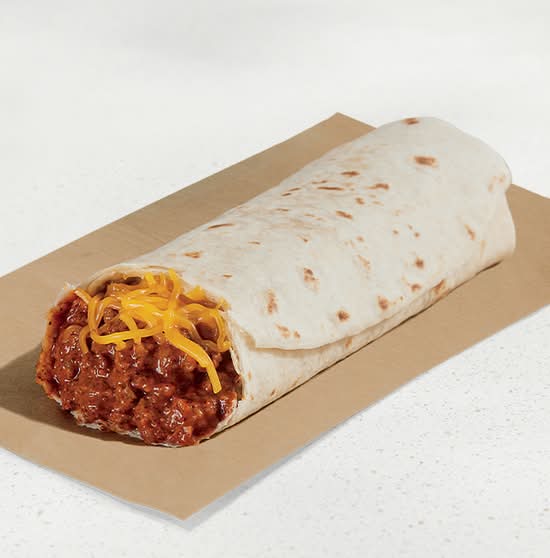 Hearty chili and cheddar cheese wrapped in a tortilla for a comforting classic. (380 cal.)