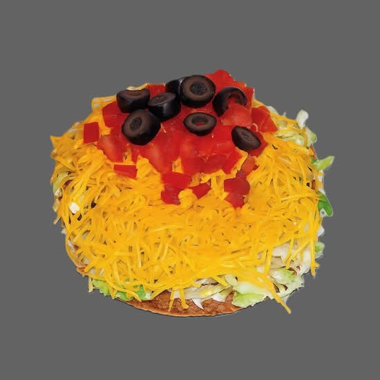 A flat crisp, deep-fried corn tortilla covered with refried beans, a scoop of 100% ground beef, a touch of our mild red sauce, real sour cream, fresh shredded lettuce, real cheddar cheese, black olives, and tomatoes. 410 cal.