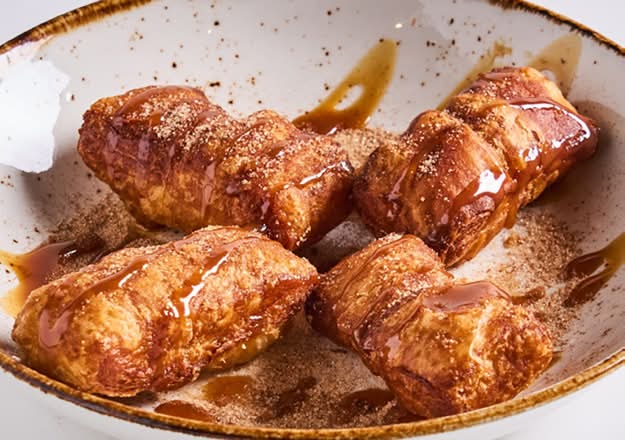 Fried croissant pastry sprinkled with cinnamon sugar and drizzled with a choice of either caramel or chocolate sauce