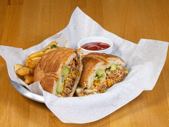 Smoked chipotle chicken, roasted adobe corn, avocado, lettuce, black bean spread, queso fresco, jalapeño aioli