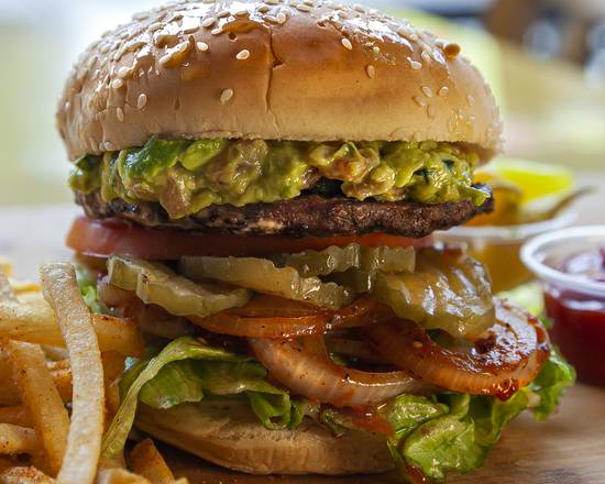 1/4 pound fresh lean beef patty with guacamole, grilled onions, chipotle sauce, lettuce, tomatoes, pickles, and special sauce.