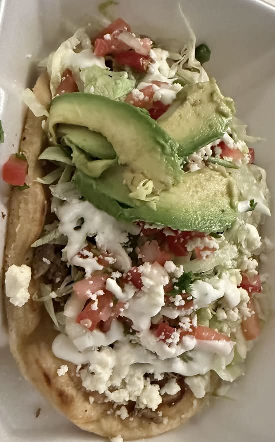 Masa de maíz frita hecha a mano con frijoles fritos, tu elección de carne, lechuga, queso fresco, aguacate, crema agria y pico de gallo. / Fried handmade corn dough with fried beans, your choice of meat, lettuce, fresh cheese, avocado, sour cream, and pico de gallo.