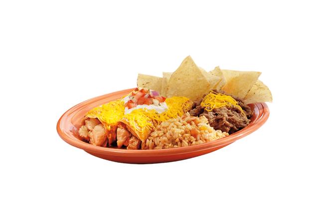 Two white corn tortilla enchiladas with fat-free pinto beans, beef or chicken. Covered with burrito sauce, Cheddar cheese then topped with sour cream, and Pico de Gallo. Served with a side of fat-free pinto beans and rice.