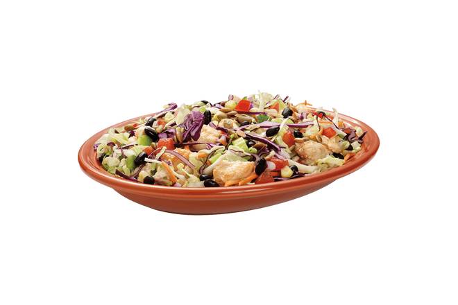 Iceberg lettuce, whole black beans and/or pinto beans, Pico de Gallo, corn salsa, pumpkin seeds, and an assortment of diced vegetables.