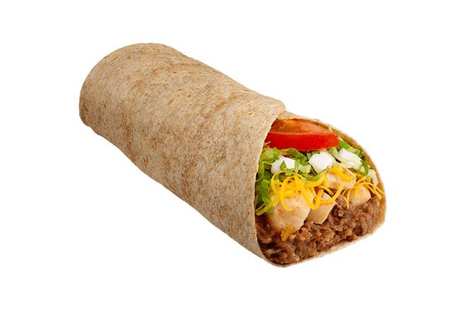 A whole-wheat tortilla filled with fat-free pinto beans, beef or chicken topped with cheddar cheese, ranch dressing, lettuce and tomatoes.