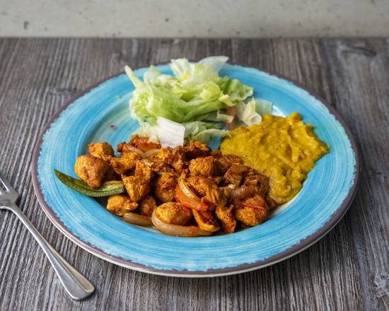 Cubed chicken sautéed with onions, jalapenos, and tomatoes sauteed with special tadu berbere based spices. Served with salad and a choice from misir wot, kik alicha, gomen, and alicha tikil gomen or key sir.