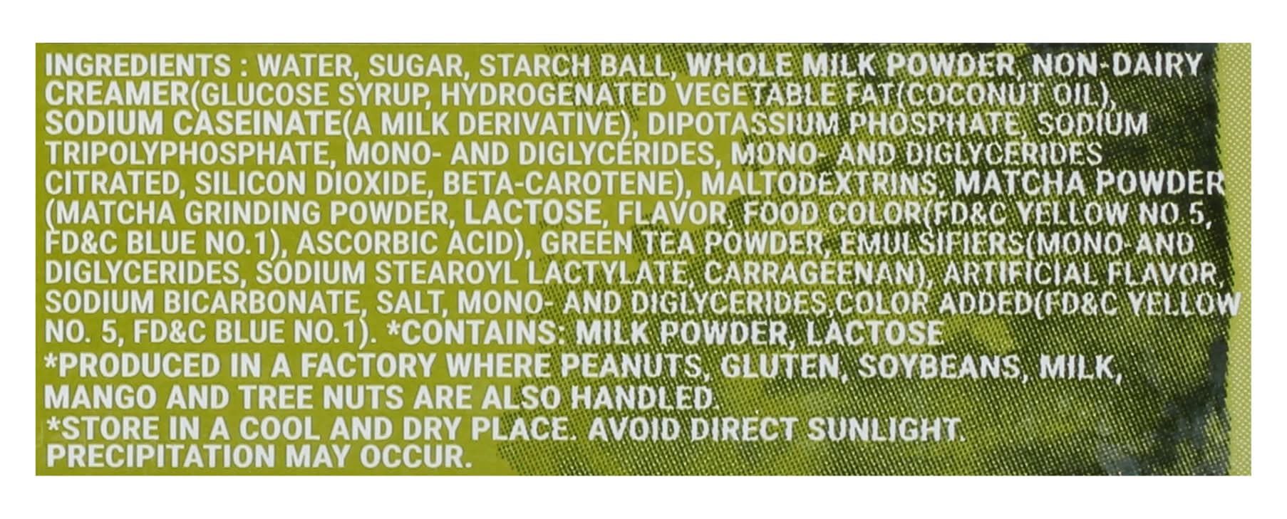 Ingredients: Water, Sugar, Starch Ball, Whole Milk Powder, Non-Dairy Creamer (Glucose Syrup, Hydrogenated Vegetable Fat (Coconut Oil), Sodium Caseinate (a Milk Derivative), Dipotassium Phosphate, Sodium Tripolyphosphate, Mono- and Diglycerides, Mono- and Diglycerides Citrated, Silicon Dioxide, Beta-Carotene), Maltodextrins, Matcha Powder (Matcha Grinding Powder, Lactose, Flavor, Food Color (FD&C Yellow 5, FD&C Blue 1), Ascorbic Acid), Green Tea Powder, Emulsifiers (Mono-and Diglycerides, Sodium Stearoyl Lactylate, Carrageenan), Artificial Flavor, Sodium Bicarbonate, Salt, Mono- and Diglycerides, Color Added (FD&C Yellow 5, FD&C Blue 1) Contains: Lactose, Tree Nuts, Coconuts, Milk, Peanuts, Gluten, Soybeans, Tree Nuts, Milk