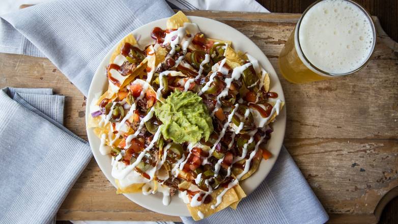 House-made queso, jalapeños, sour cream, guacamole, tomato, red onion, KC burnt ends and BBQ sauce.