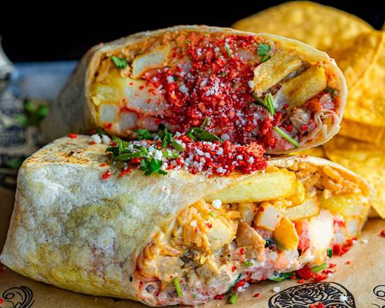 California style burrito: flour tortilla, Mexican rice, your choice of protein, cheese sauce, pico de gallo, French fries, Chihuahua cheese, avocado salsa, takis, and cilantro.