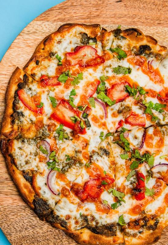 Tandoori Chicken, Mozzarella, Nut-Free Spinach Pesto, Red Onion, Cilantro, Mango Chili Drizzle.