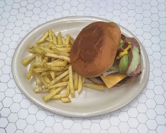Prepared with hamburger patty, american cheese, ham, mayo, lettuce, avocado, tomatoes, onions, jalapenos, ketchup, and mustard. Served with fries.
