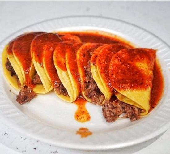 Tacos de barbacoa de res ...bañados en una salsa de chile de arbol.