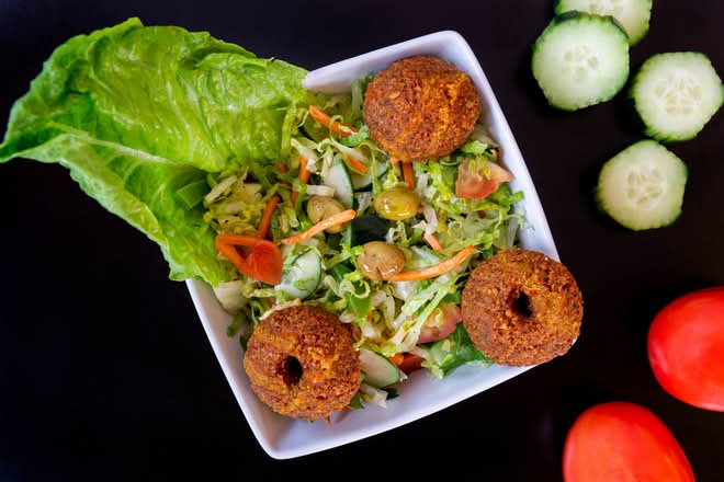 Lettuce, tomatoes, cucumber, colorful cabbage, olive oil, lemon juice, apple cider vinegar, sumac with Falafel