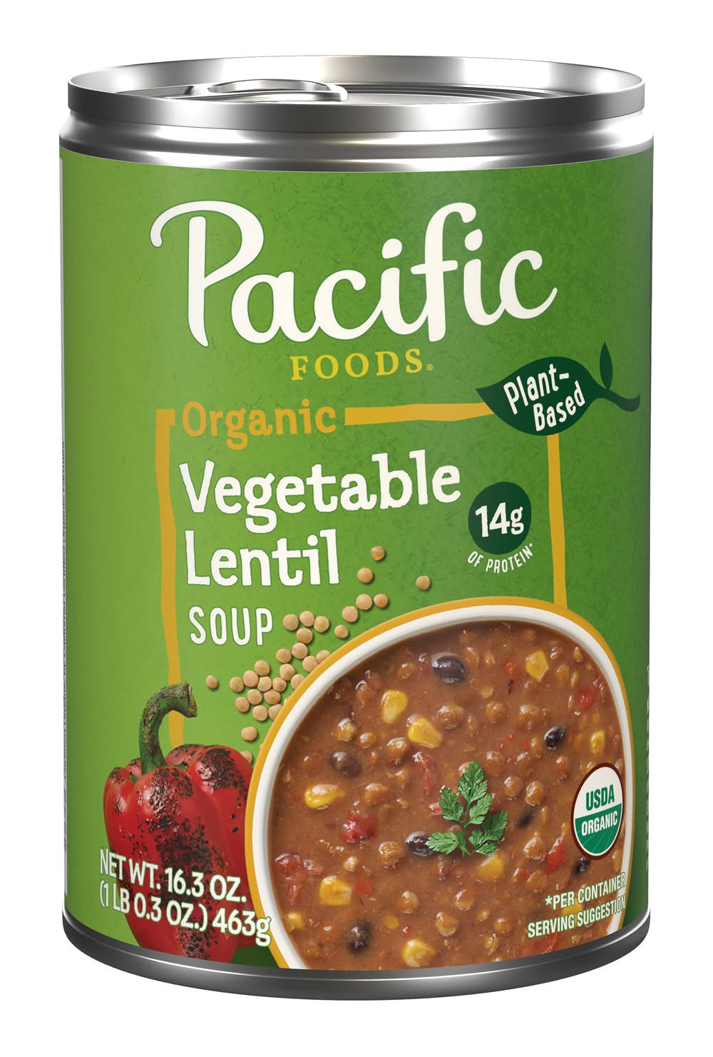Immerse your taste buds into something truly unique with Pacific Foods Organic Vegetable Lentil Soup. This vegetarian organic soup has the rich flavor of lentils and black beans. Fire-roasted red peppers and vine-ripened tomatoes round out the flavor of this plant based soup, bringing a classic recipe to a whole new level of goodness. Enjoy it on its own as a quick and easy snack, customize it with your favorite toppings or pair soups with a salad, sandwich or wrap. USDA Certified Organic and made with non-GMO ingredients, this vegetable soup contains 14 grams of protein per can, is a good source of fiber* and is made with no MSG, high fructose corn syrup, artificial colors or artificial flavors added. The soup can is recyclable for easy disposal. To prepare, simply pour it into a saucepan or microwave-safe bowl, heat until hot, stir and enjoy. Microwave on high for 3 minutes and let stand for 1 minute. Every spoonful of our vegan soup is satisfying to the last drop. In addition to our Vegetable Lentil soup, we offer Chicken Noodle, Chicken and Wild Rice and more. At Pacific Foods, we're dedicated to making the most nourishing foods possible from carefully sourced ingredients. *See nutrition facts for sodium content • Flavor: Vegetable lentil • Packaging: Reusable