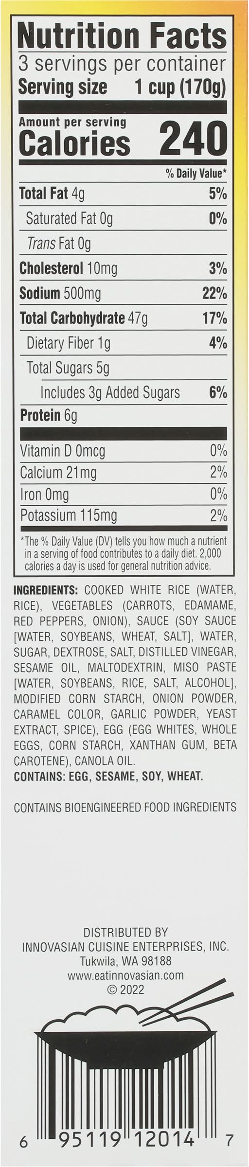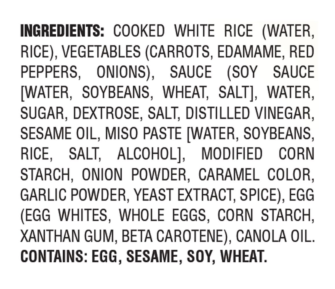Ingredients: Cooked White Rice (Water, Rice), Vegetables (Carrots, Edamame, Red Peppers, Onions), Sauce (Soy Sauce [Water, Soybeans, Wheat, Salt], Water, Sugar, Dextrose, Salt, Distilled Vinegar, Sesame Oil, Miso Paste [Water, Soybeans, Rice, Salt, Alcohol], Modified Corn Starch, Onion Powder, Caramel Color, Garlic Powder, Yeast Extract, Spice), Egg (Egg Whites, Whole Eggs, Corn Starch, Xanthan Gum, Beta Carotene), Canola Oil Contains: Eggs, Sesame, Soybeans, Wheat, Corn