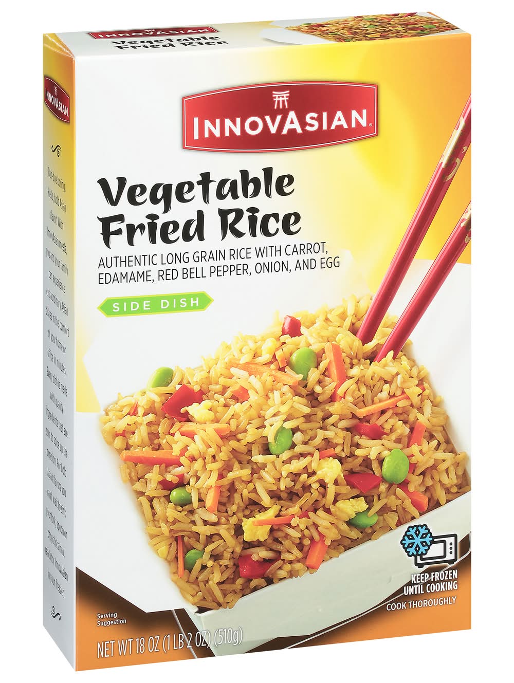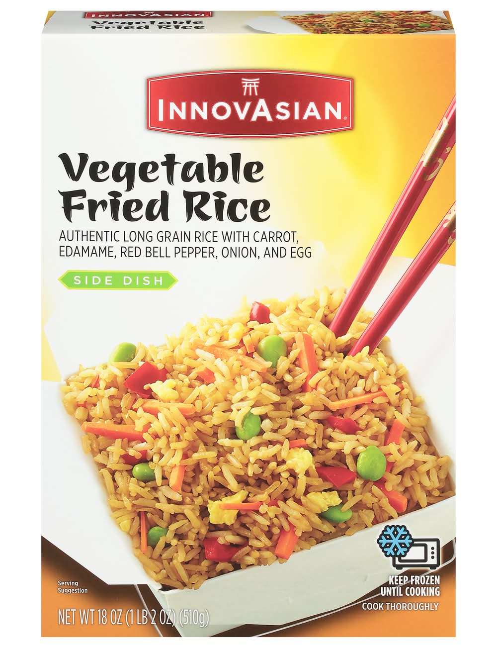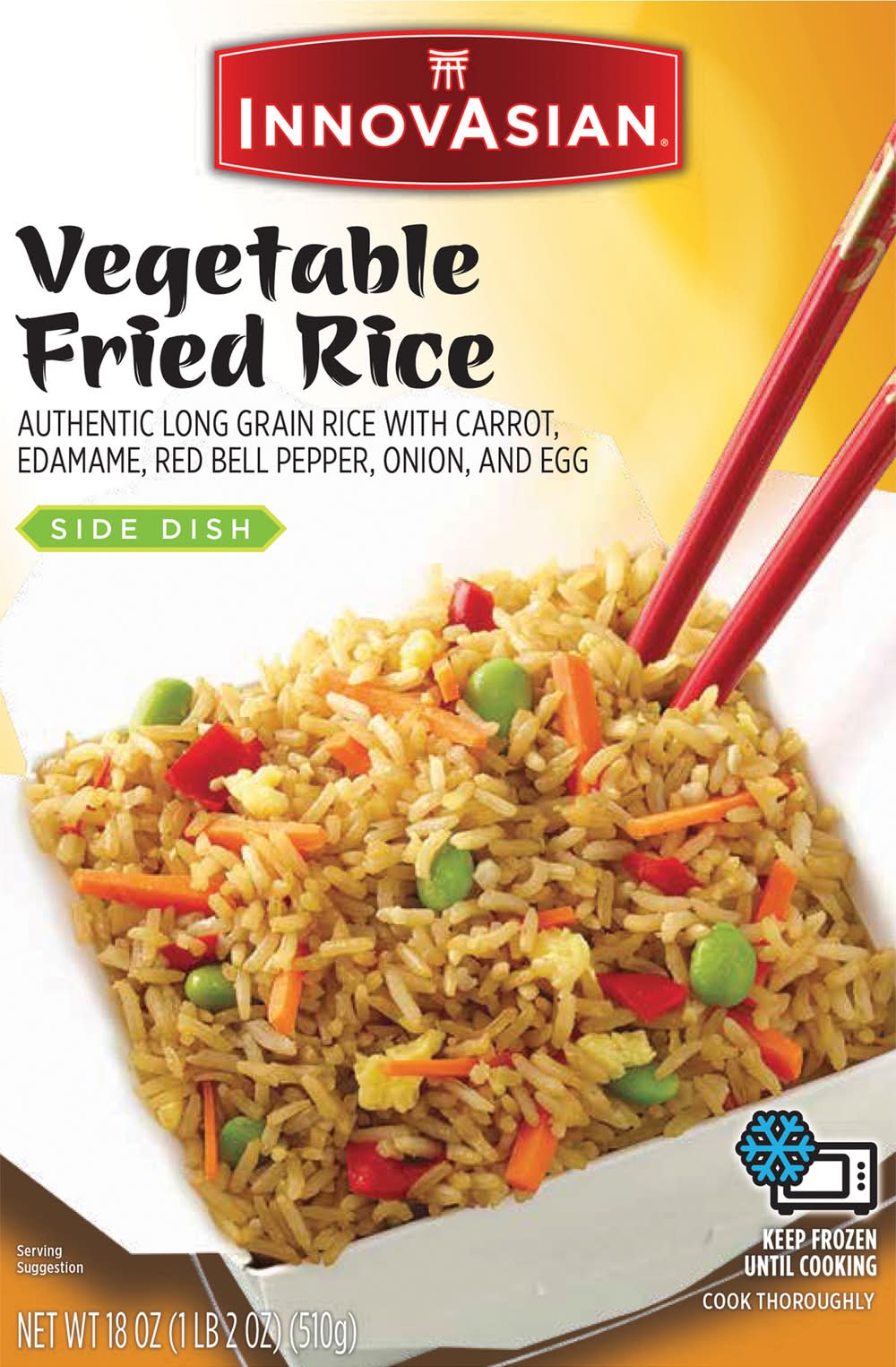Buh-bye boring. Hello, bold Asian flavor! With InnovAsian meals, you and your family can experience extraordinary Asian-style dishes in the comfort of your home or office in minutes. Every dish is made with quality ingredients that are sure to spice up the occasion. For bold Asian flavors you can’t wait to sink your fork, spoon or chopsticks into, reach for InnovAsian in your freezer. InnovAsian Vegetable Fried Rice frozen side dish is made with seasoned long grain rice blended with carrots, edamame, red bell pepper, onion, and scrambled eggs. Make it a meal and serve with InnovAsian Orange Chicken, General Tso's or add one of our delicious noodle dishes or appetizers! When the craving strikes, let InnovAsian's line of frozen meals electrify your taste buds and make anytime an InnovAsian Occasion! Flavor: Vegetable
