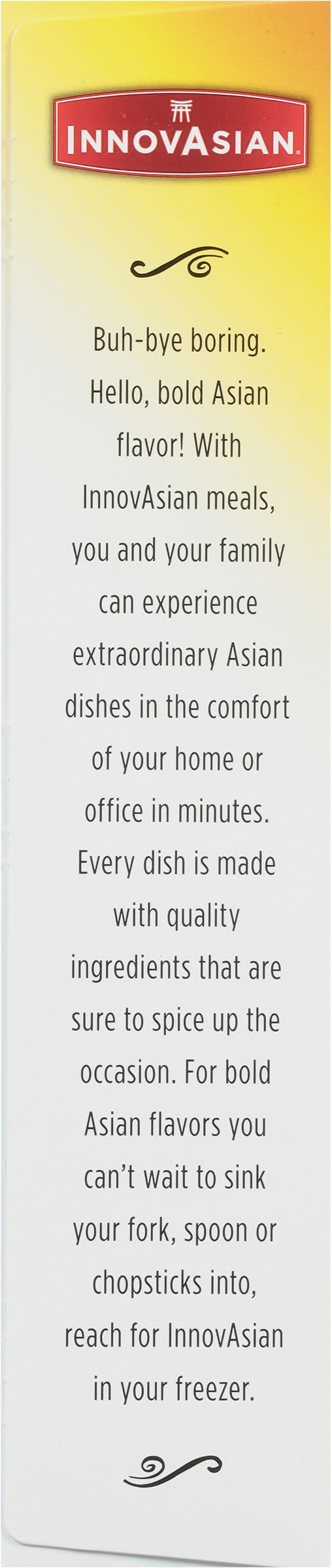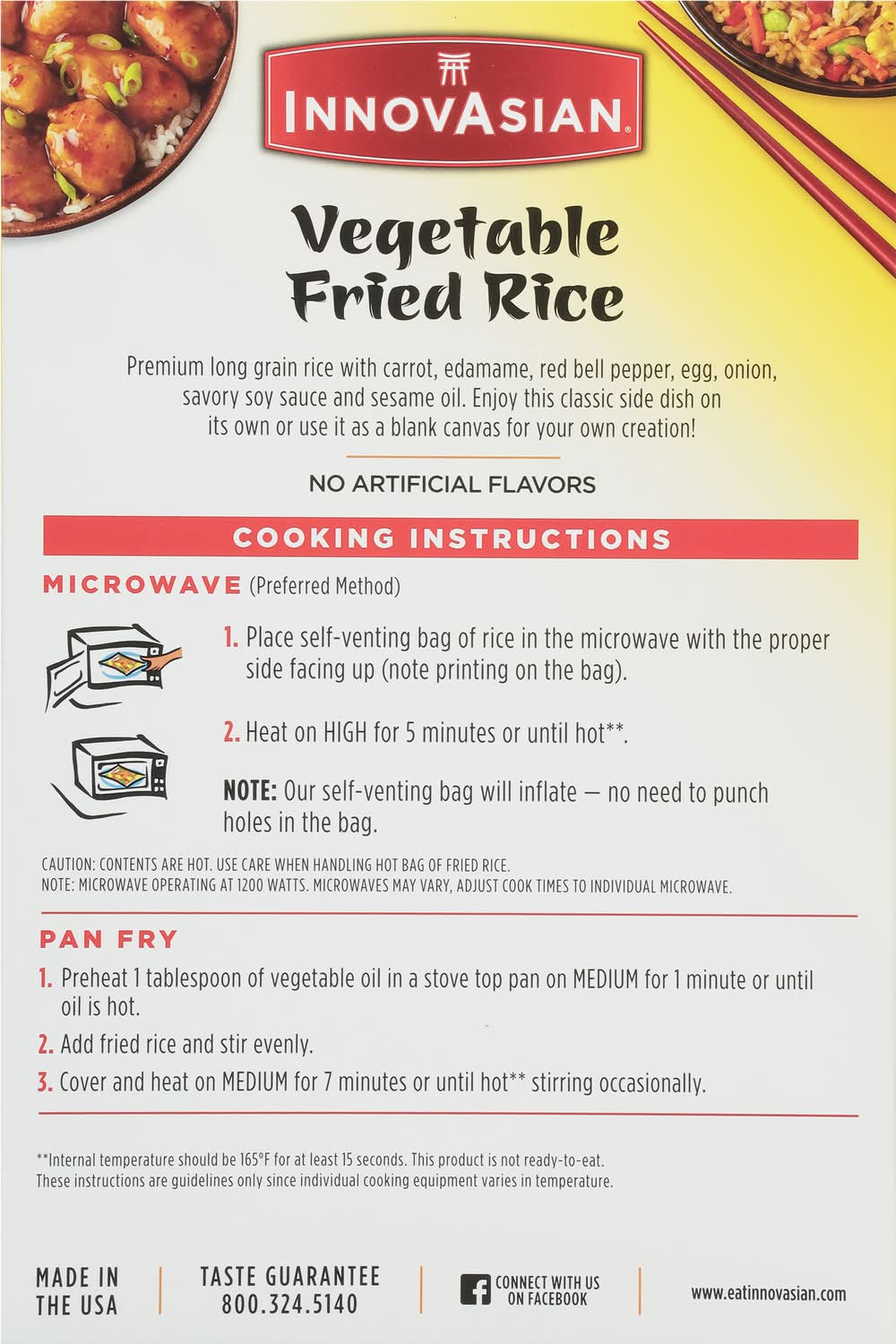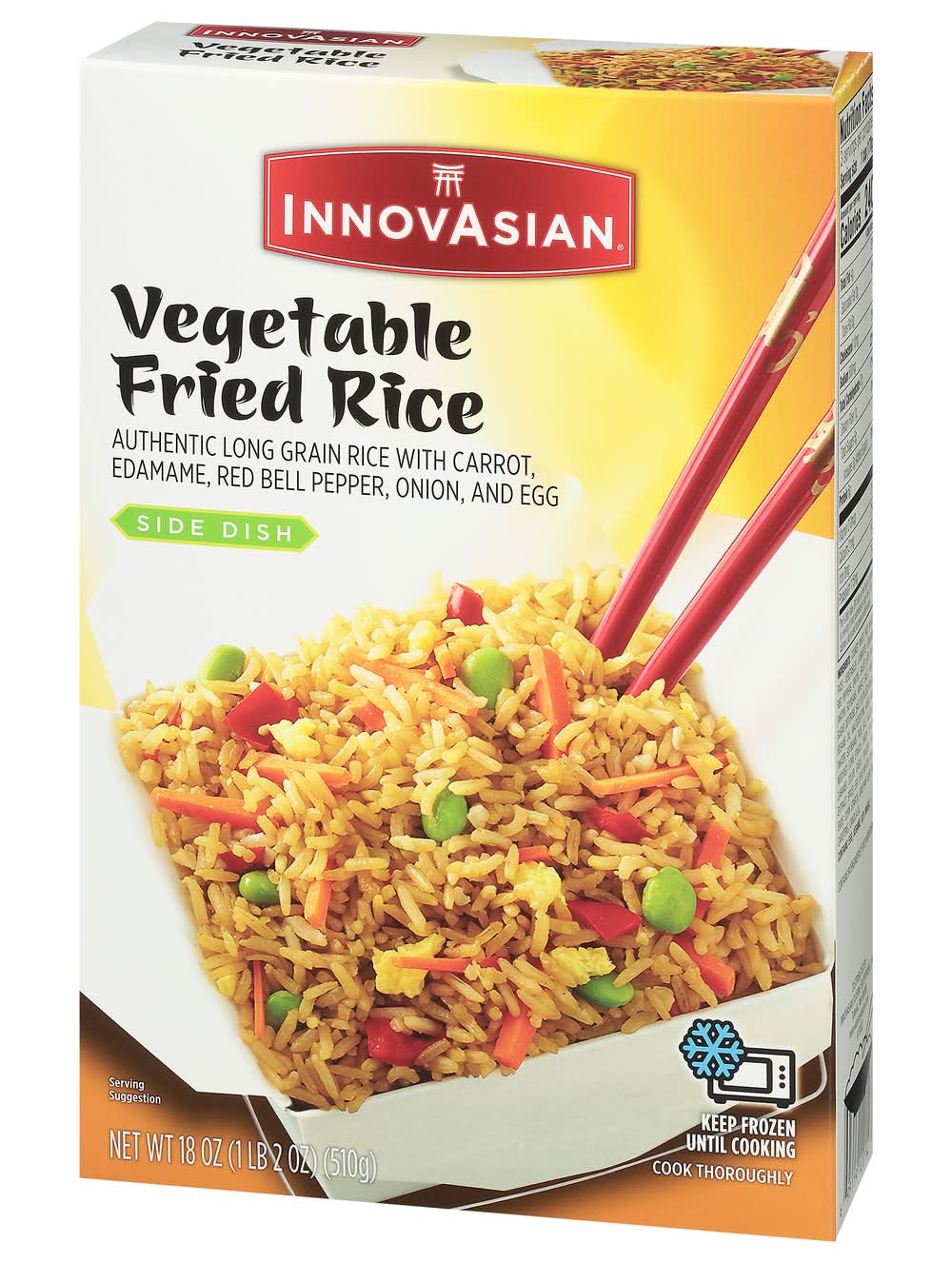 Buh-bye boring. Hello, bold Asian flavor! With InnovAsian meals, you and your family can experience extraordinary Asian-style dishes in the comfort of your home or office in minutes. Every dish is made with quality ingredients that are sure to spice up the occasion. For bold Asian flavors you can’t wait to sink your fork, spoon or chopsticks into, reach for InnovAsian in your freezer. InnovAsian Vegetable Fried Rice frozen side dish is made with seasoned long grain rice blended with carrots, edamame, red bell pepper, onion, and scrambled eggs. Make it a meal and serve with InnovAsian Orange Chicken, General Tso's or add one of our delicious noodle dishes or appetizers! When the craving strikes, let InnovAsian's line of frozen meals electrify your taste buds and make anytime an InnovAsian Occasion! Flavor: Vegetable