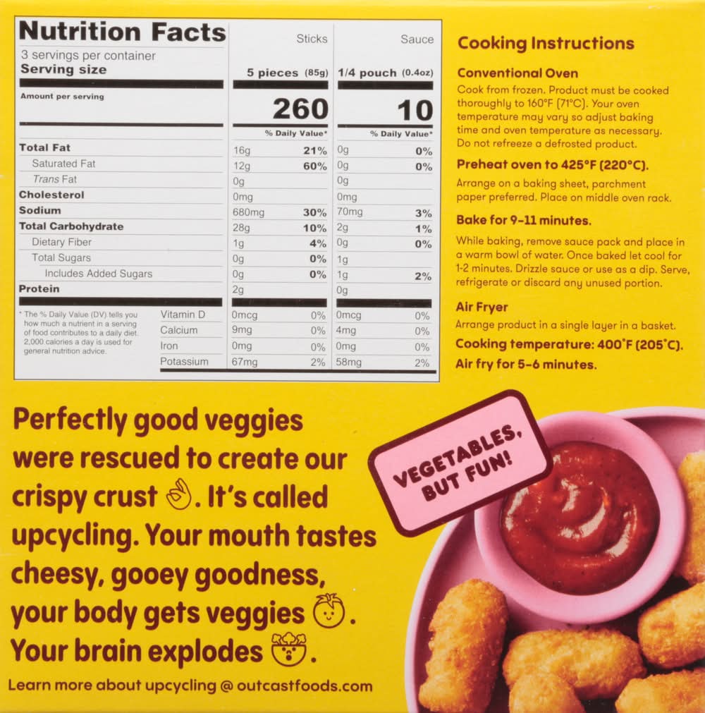 Ingredients: Plant Based Style Mozzarella: Filtered Water, Coconut Oil, Potato Starch, Modified Starch (Potato and Tapioca), Chickpea Protein, Sea Salt, Potato Protein, Natural Flavor (Vegan Sources), Lactic Acid, Beta Carotene (Color), in a Coating of: Water, Panko Bread Crumb (Rice Flour, Pea Protein, Dextrose, Baking Soda), Rice Flour, Modified Corn Starch, Potato Starch, Sunflower Oil, Corn Flour, Rice Starch, Dehydrated Upcycled Cauliflower Powder, Sea Salt, Yeast Extract, Sodium Acid Pyrophosphate, Baking Soda, Spice, Xanthan Gum, Garlic Powder, Onion Powder. Sauce: Water, Tomato Paste, Cane Sugar, Vinegar, Salt, Dried Garlic, Modified Potato Starch, Sunflower Oil, Herbs, Spices, Xanthan Gum Contains: Tree Nuts, Coconuts, Corn