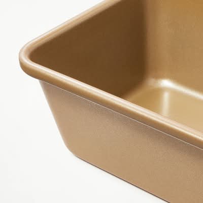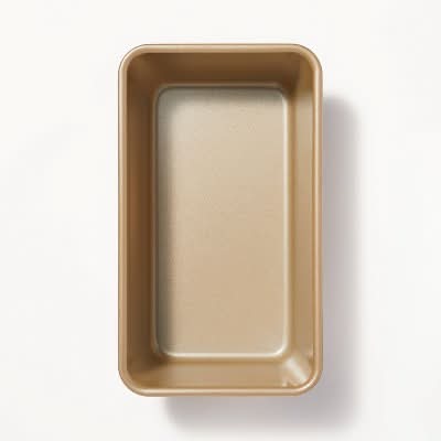 This loaf pan features a solid finish to add a glam touch to your bakeware, and it's made from wire-reinforced aluminized steel that heats evenly and resists warping. The smooth, easy-to-clean nonstick surface is dishwasher safe and offers convenient use, and the pan is oven safe up to 450 degrees Fahrenheit. • Color: Gold • Size: 5"x9"