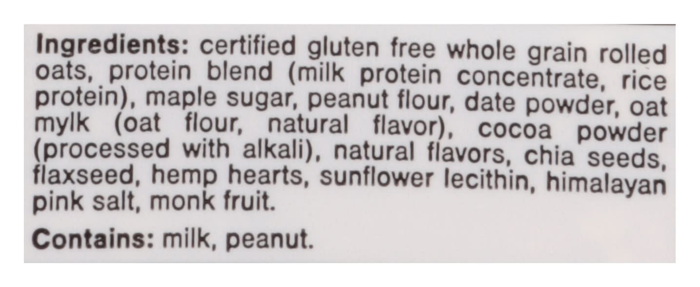 Ingredients: Certified Gluten Free Whole Grain Rolled Oats, Protein Blend (Milk Protein Concentrate, Rice Protein), Maple Sugar, Peanut Flour, Date Powder, Oat Milk (Oat Flour, Natural Flavor), Cocoa Powder (Processed with Alkali), Natural Flavors, Chia Seeds, Flaxseed, Hemp Hearts, Sunflower Lecithin, Himalayan Pink Salt, Monk Fruit Contains: Milk, Peanuts, Oat