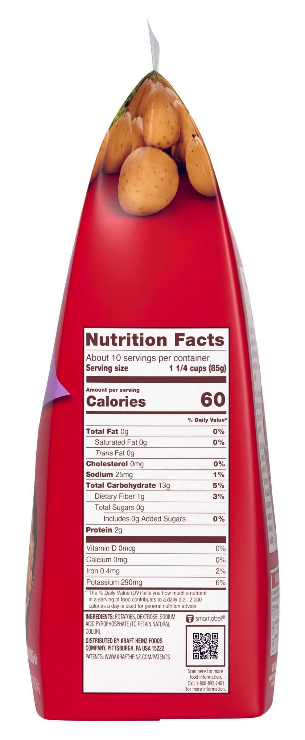 Shredded Hash Brown Potatoes make it easy to enjoy easy hash browns at home. These hash browns are made from freshly peeled, American grown potatoes. These gluten free shredded hash browns offer a golden, crispy texture to make your next family breakfast a success. Toss these shredded potatoes in a skillet with a little oil to cook them according to package instructions for perfectly crispy results. A classic potato option, these frozen hash browns are perfect as a breakfast side dish or in a casserole. Kraft Heinz Foods Company, Pittsburgh, PA, 15222