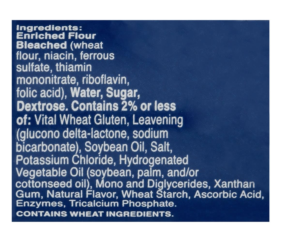 Ingredients: Enriched Flour Bleached (Wheat Flour Niacin Ferrous Sulfate Thiamin Mononitrate Riboflavin Folic Acid), Water, Sugar, Dextrose, Contains 2% or Less of: Vital Wheat Gluten, Leavening (Glucono Delta-Lactone Sodium Bicarbonate), Soybean Oil, Salt, Potassium Chloride, Hydrogenated Vegetable Oil (Soybean Palm and/or Cottonseed Oil), Mono and Diglycerides, Xanthan Gum, Natural Flavor, Wheat Starch, Ascorbic Acid, Enzymes, Tricalcium Phosphate Contains: Wheat, Gluten, Soybeans