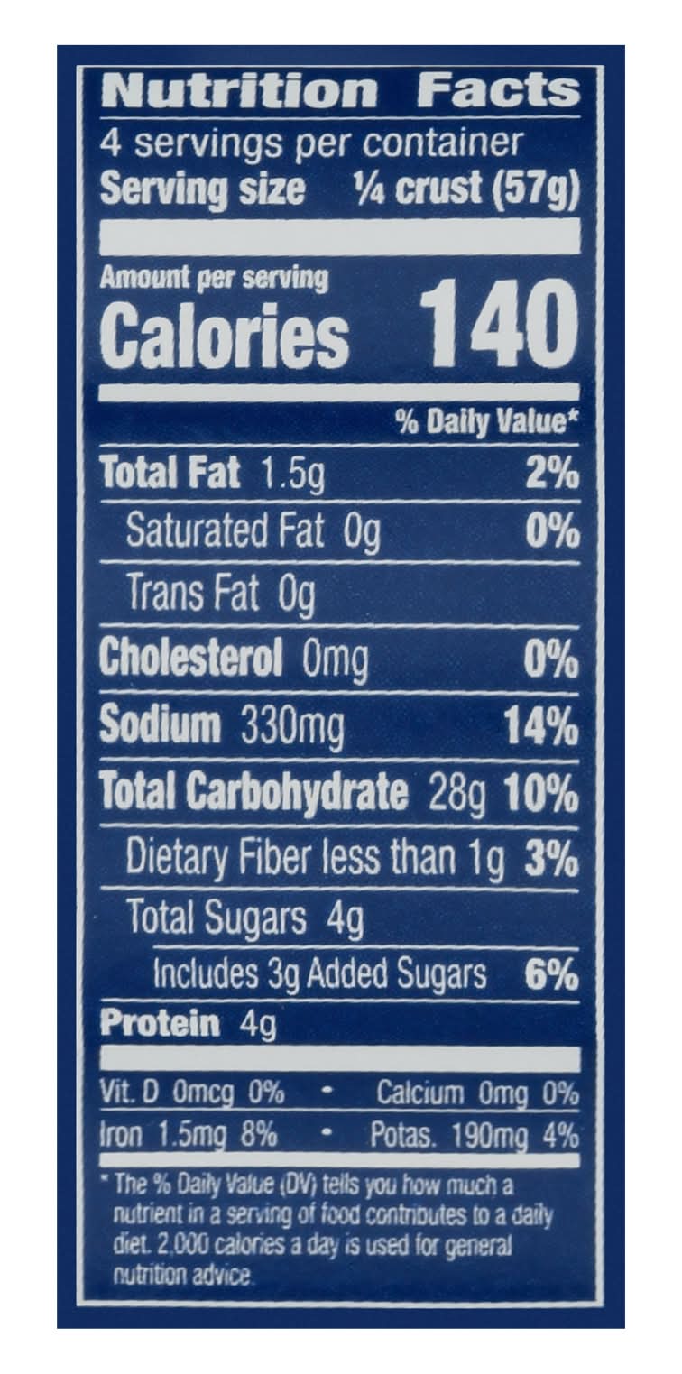 Per 1/4 Crust: 140 calories; 0 g sat fat (0% DV); 330 mg sodium (14% DV); 4 g total sugars. Ingredients derived from a bioengineered source. Box Tops for Education. Scan your receipt. Earn cash for school.
