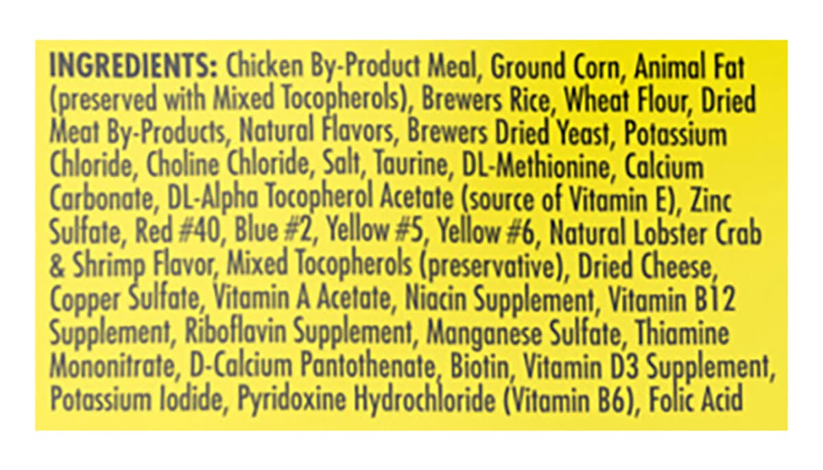 Ingredients: Chicken By-Product Meal, Ground Corn, Animal Fat (Preserved with Mixed Tocopherols), Brewers Rice, Wheat Flour, Dried Meat By-Products, Natural Flavors, Brewers Dried Yeast, Potassium Chloride, Choline Chloride, Salt, Taurine, DL-Methionine, Calcium Carbonate, DL-Alpha Tocopherol Acetate (Source of Vitamin E), Zinc Sulfate, Red 40, Blue 2, Yellow 5, Yellow 6, Natural Lobster Crab & Shrimp Flavor, Mixed Tocopherols (Preservative), Dried Cheese, Copper Sulfate, Vitamin A Acetate, Niacin Supplement, Vitamin B12 Supplement, Riboflavin Supplement, Manganese Sulfate, Thiamine Mononitrate, D-Calcium Pantothenate, Biotin, Vitamin D3 Supplement, Potassium Iodide, Pyridoxine Hydrochloride (Vitamin B6), Folic Acid Contains: Corn, Wheat, Crustacean Shellfish, Lobster, Crustacean Shellfish, Crab, Crustacean Shellfish, Shrimp