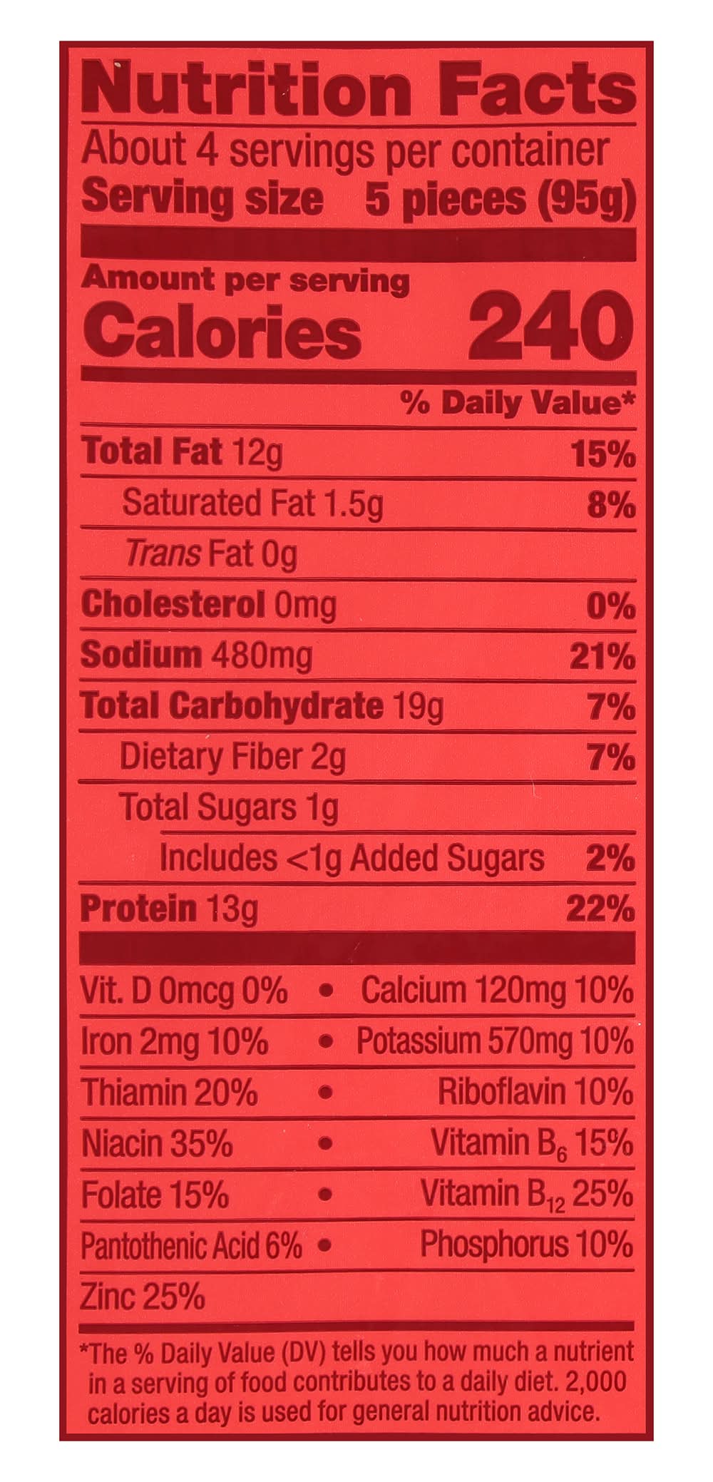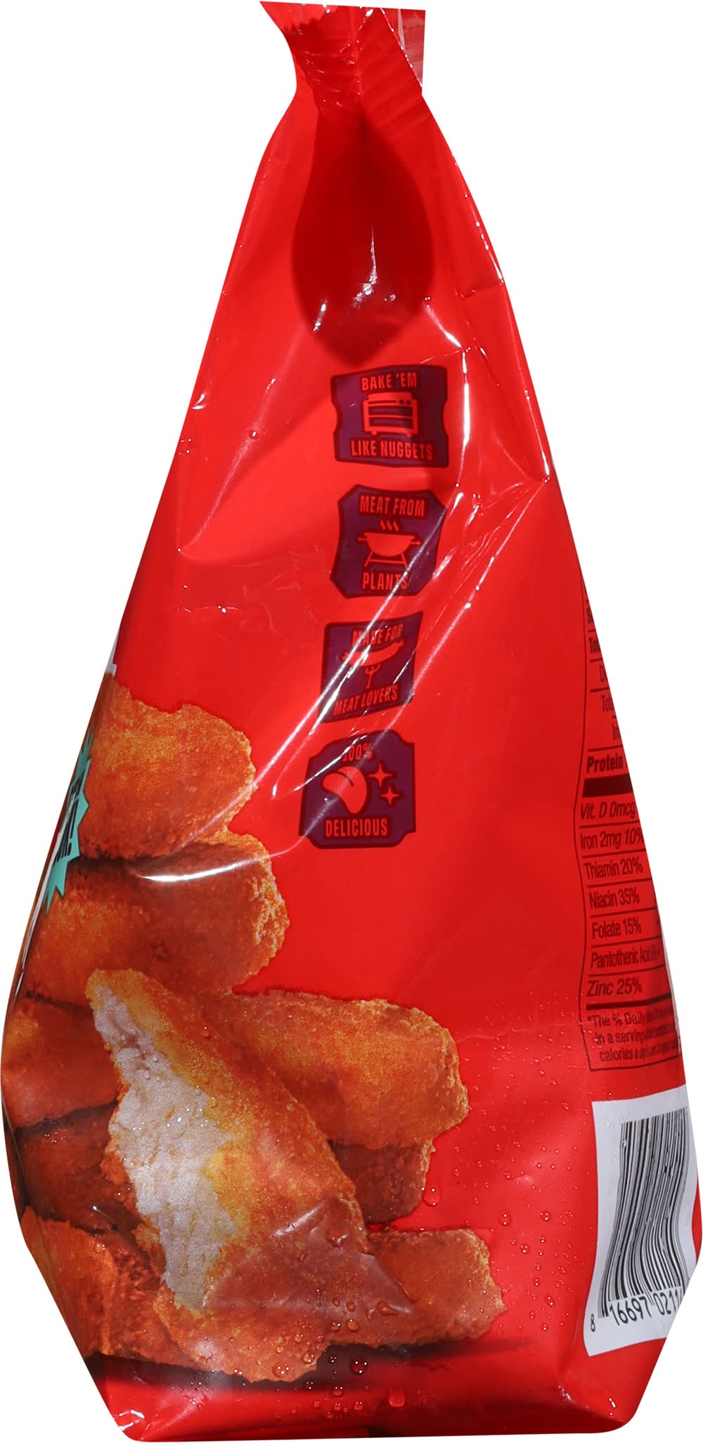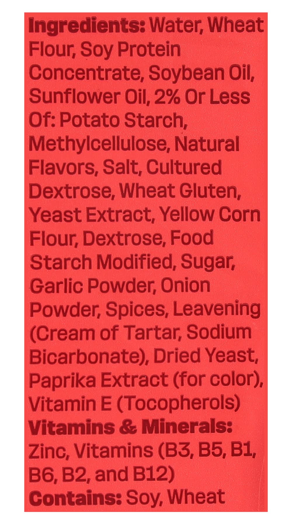 Ingredients: Water, Wheat Flour, Soy Protein Concentrate, Soybean Oil, Sunflower Oil, 2% or Less of: Potato Starch, Methylcellulose, Natural Flavors, Salt, Cultured Dextrose, Wheat Gluten, Yeast Extract, Yellow Corn Flour, Dextrose, Food Starch Modified, Sugar, Garlic Powder, Onion Powder, Spices, Leavening (Cream of Tartar, Sodium Bicarbonate), Dried Yeast, Paprika Extract (for Color), Vitamin E (Tocopherols) Vitamins & Minerals: Zinc, Vitamins (B3, B5, B1, B6, B2, and B12) Contains: Soybeans, Wheat, Gluten