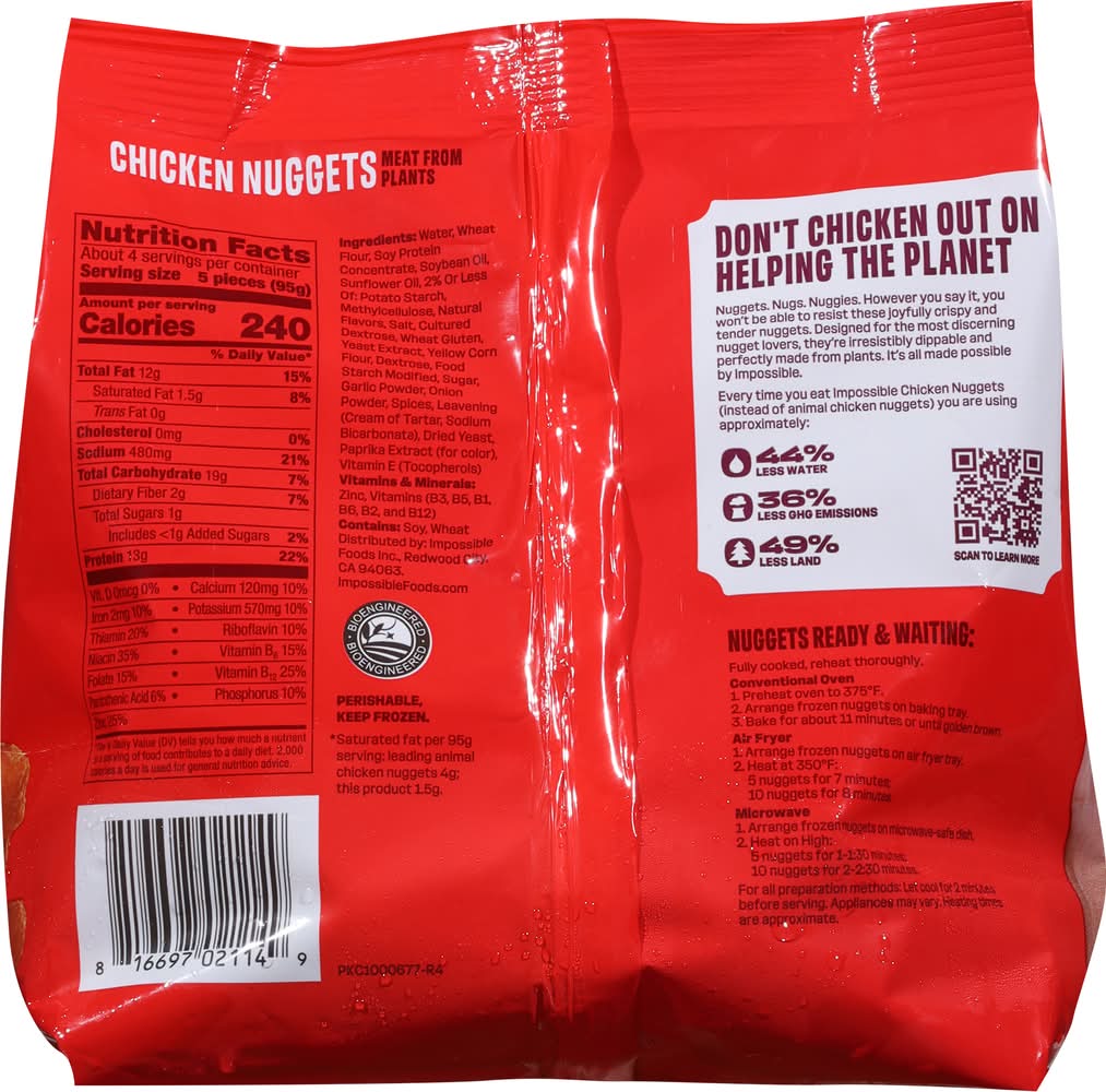 Imagine, if the humble, perfect chicken nugget could get even better. Well stop imagining, because you've already come to the webpage that is about to explain to you that we have totally made the chicken nugget better by making it from plants. Tender, juicy, crispy, flaky, scrumptious–these are all acceptable adjectives to encompass these little meat-from-plants morsels. Your imagination is just plagiarizing at this point. Anyway, keep an eye out for the red bag in the freezer section or just hit Add to Cart! Impossible Foods Inc., Redwood City,CA,94063