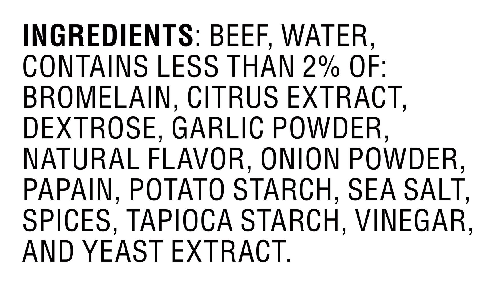 Ingredients: Beef, Water, Contains Less than 2% of: Bromelain Citrus Extract, Dextrose, Garlic Powder, Natural Flavor, Onion Powder, Papain, Potato Starch, Sea Salt, Spices, Tapioca Starch, Vinegar, and Yeast Extract