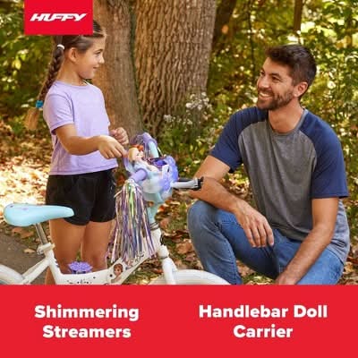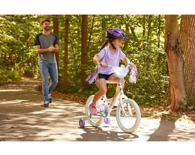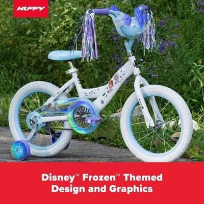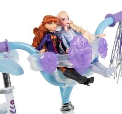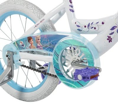 Fun Frozen adventures are up ahead with this 16-inch Disney Frozen II bike for girls. Lovers of Elsa and Anna will certainly delight in this beautiful bike with training wheels. The durable white steel frame is designed with whimsical Frozen details and, of course, the royal sisters of Arendelle! In addition to the lovely frame design, this bike also features fun accessories like the shimmering streamers and the handlebar doll carrier so her Frozen dolls (not included) can join her on her next royal adventure. This bike doesn’t just a wonderful design, but also great features that can help mom and dad feel confident that your rider is safe! The stable training wheels help your girl ride confidently and can be removed when she’s ready for 2 wheels. The coaster brake is easy to engage so she can control her speed, and the saddle and grips keep her comfortable throughout her ride. • Color: Frozen white • Size: 16 in