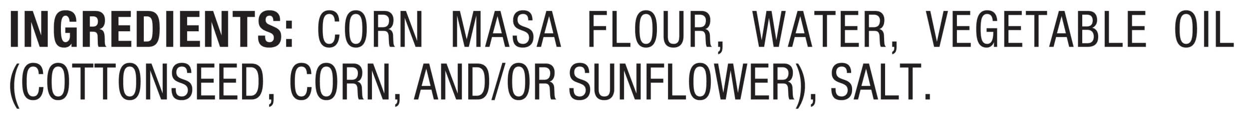 Ingredients: Corn Masa Flour (Niacin, Reduced Iron, Thiamine Mononitrate, Riboflavin), Water, Vegetable Oil (Contains One Or More Of The Following: Corn Oil, Cottonseed Oil, Palm Oil, Sunflower Oil), Salt.