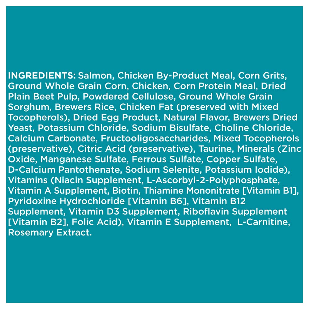 Ingredients: Salmon Chicken By-Product Meal Corn Grits Ground Whole Grain Corn Chicken Meal Corn Gluten Meal Dried Plain Beet Pulp, Powdered Cellulose Ground Whole Grain Sorghum Brewers Rice Chicken Fat (Preserved with Mixed Tocopherols) Natural Flavor, Sodium Bisulfate Dried Egg Product Brewers Dried Yeast Potassium Chloride Choline Chloride Fructooligosaccharides, Vitamins (Vitamin E Supplement, Niacin, Ascorbic Acid, Vitamin A Acetate, Calcium Pantothenate, Biotin, Thiamine Mononitrate (Source of Vitamin B1), Pyridoxine Hydrochloride (Source of Vitamin B6) Vitamin B12 Supplement Riboflavin Supplement (Source of Vitamin B2) Inositol, Vitamin D3 Supplement Folic Acid) Calcium Carbonate Minerals (Zinc Oxide, Manganese Sulfate, Copper Sulfate, Potassium Iodide) Taurine L-Carnitine Mixed Tocopherols and Citric Acid (Preservatives) Rosemary Extract. Contains: Fish, Salmon, Eggs