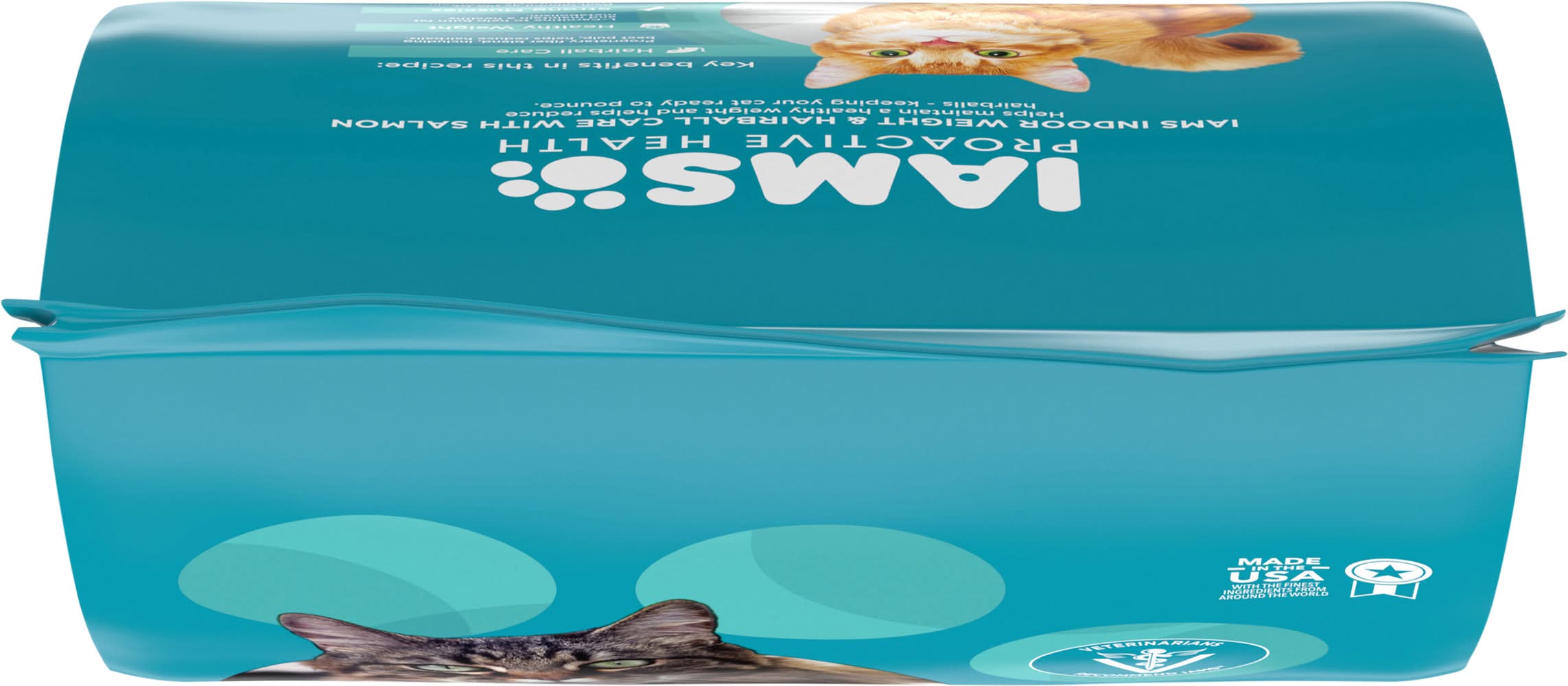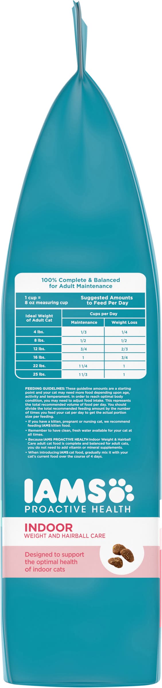 Directions: best used by date on bag. suggested amounts to feed per day: weight of adult cat: 4 lb; cups per day when fed alone: maintenance 1/3; weight loss 1/4. weight of adult cat: 8 lb; cups per day when fed alone: maintenance 2/3; weight loss 1/2. weight of adult cat: 12 lb; cups per day when fed alone: maintenance 3/4; weight loss 2/3. weight of adult cat: 16 lb; cups per day when fed alone: maintenance 1; weight loss 3/4. weight of adult cat: 22 lb; cups per day when fed alone: maintenance 1-1/4; weight loss 1. weight of adult cat: 25 lb; cups per day when fed alone: maintenance 1-1/3; weight loss 1. feeding guidelines: these guideline amounts are a starting point and your cat may need more food depending upon age activity and temperament. in order to reach optimal body condition, you may need to adjust food intake. this represents the total recommended volume of food per day. you should divide the total recommended feeding amount by the number of times you feed your cat per day to get the actual portion size per feeding. if you have a kitten pregnant or nursing cat we recommend feeding kitten food. remember to have clean, fresh water available for your cat at all times. because iams indoor weight & hairball care with salmon cat food is complete and balanced for maintenance you do not need to add vitamin or mineral supplements. when introducing iams cat food gradually mix it with your cat's current food over the course of 4 days.