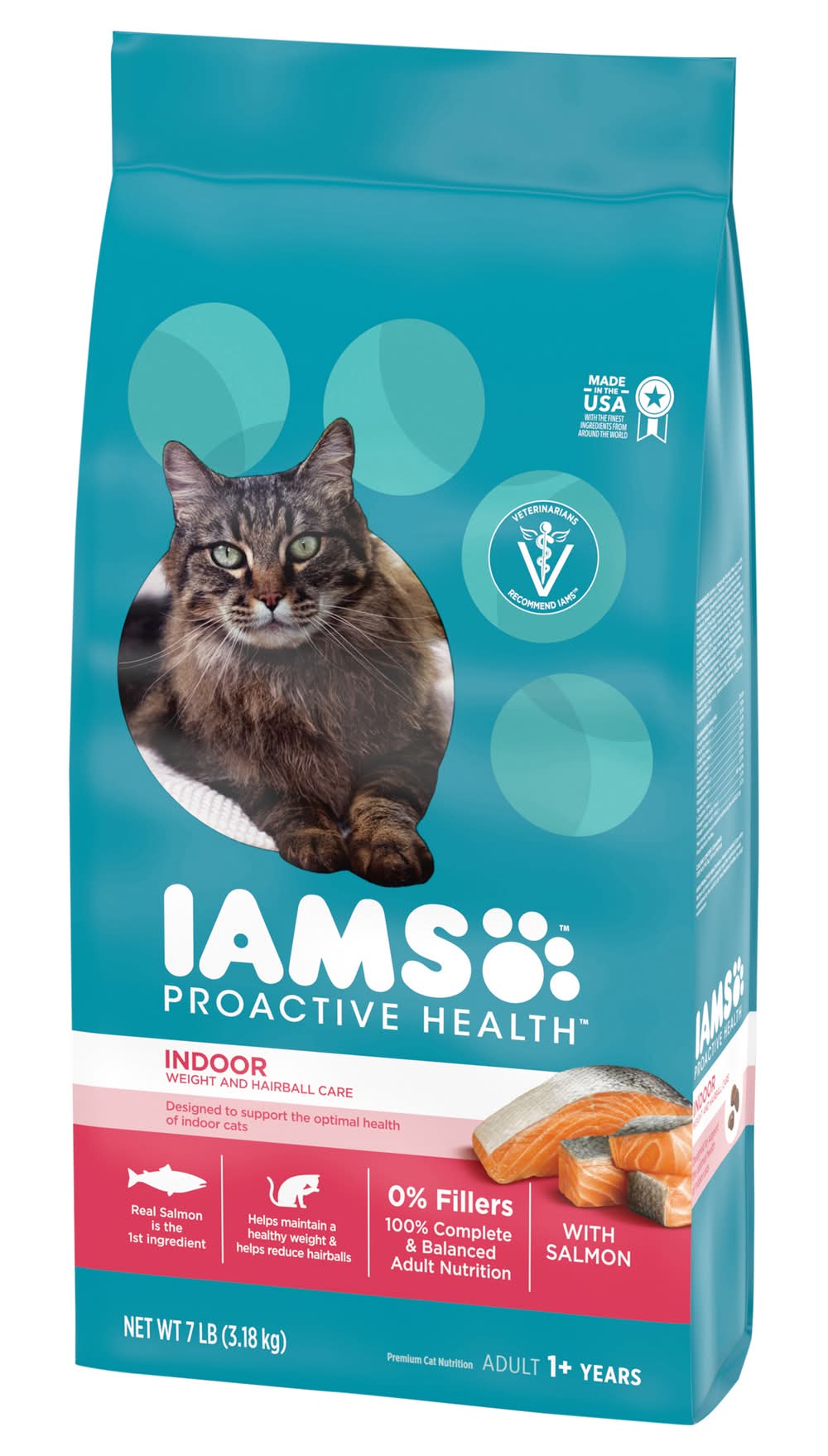 Premium Indoor Adult 1+ Years Weight and Hairball Care with Salmon Cat Nutrition Packaging: Reusable